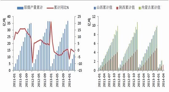 4月國內(nèi)原煤產(chǎn)量 3.01 億噸,環(huán)比減少 400 萬噸,當(dāng)月同比下降 1.3% ,2014年1 - 4月原煤累計(jì)產(chǎn)量 11.79 億噸,累計(jì)同比下降 1 % 。1 - 4月份的原煤產(chǎn)量數(shù)據(jù)為近幾年以來較低水平。