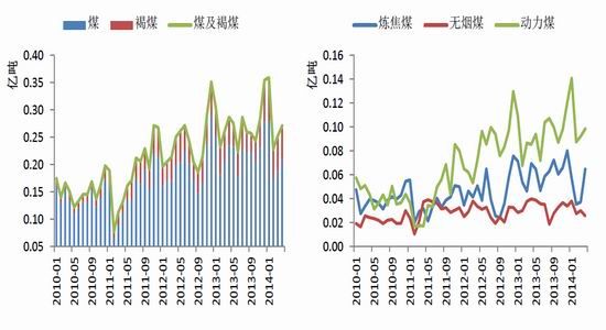 圖12:煤及褐煤進(jìn)口量 圖13: 分煤種進(jìn)口量