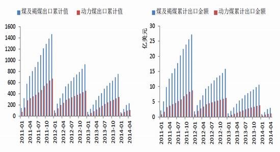 4月份我國煤及褐煤出口金額共計(jì) 4 111.46 億美元,其中動(dòng)力煤出口金額 1 397.35 億美元,1 - 4月煤及褐煤出口累計(jì)金額29 752.51億美元,其中動(dòng)力煤11 549.41億美元。