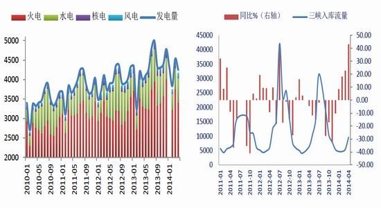 近一個(gè)月以來,南方雨水較為充沛,水電對(duì)火電的影響成為了市場關(guān)注的熱點(diǎn)。從三峽入庫流量來看,今年4月三峽平均入庫流量9622立方米/秒,同比上漲43.18%,較往年有所提前。從各種發(fā)電方式的占比來看,今年風(fēng)電、核電及其他發(fā)電方式占總發(fā)電量的比例沒有變化,而水電發(fā)電量的提升擠壓了火電市場,今年4月水電發(fā)電量占發(fā)電總量的15%,火電占80%,而去年4月水電占總量的13%,火電占82%。