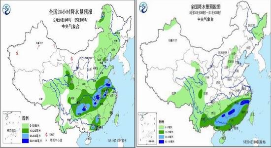 預(yù)計(jì)未來10天(5月24日至6月2日),主要降雨區(qū)位于江南、華南,累計(jì)降雨量有50-90毫米,部分地區(qū)有100-160毫米,局地可達(dá)180-260毫米。