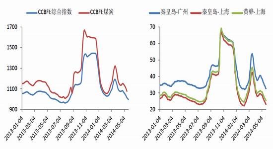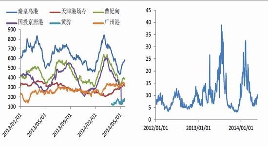 從期貨價(jià)格、環(huán)渤海動(dòng)力煤指數(shù)及CCI1指數(shù)來看,數(shù)據(jù)相關(guān)性較高,且期貨表現(xiàn)出較強(qiáng)的領(lǐng)先性,目前期貨價(jià)格向下摸索,CCI1指數(shù)也出現(xiàn)下行跡象,環(huán)渤指數(shù)是否能繼續(xù)堅(jiān)挺有待觀察。