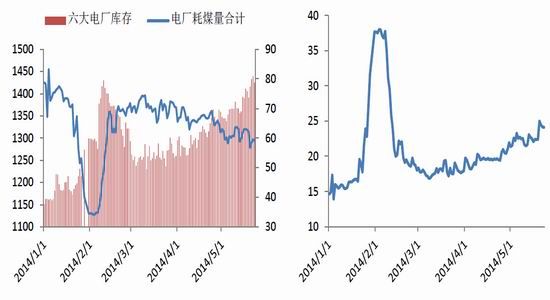 下游電廠庫存本月上升較為明顯,截至5月23日,沿海六大電廠庫存合計(jì)1425.3萬噸,同比增漲91.8萬噸,漲幅6.88%,而受制于水電發(fā)電量的增長,電廠日耗煤量不斷下降,截至5月23日,沿海六大電廠日耗煤量總計(jì)59.1萬噸,同比下跌9.1萬噸,跌幅13.6%。