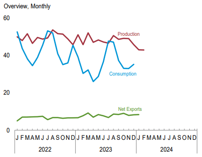 消費(fèi)方面,報(bào)告顯示,2023年12月份,美國(guó)煤炭總消費(fèi)量為3526.2萬短噸,同比下降22.32%,環(huán)比增長(zhǎng)6.87%。