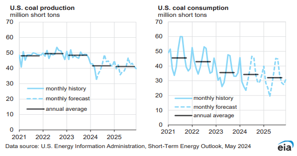 產(chǎn)量方面,《短期能源展望》報告預(yù)計,2024年,美國煤炭產(chǎn)量接近5億短噸,高于前一月預(yù)期值4.852億短噸,但較2023年的5.816億短噸下降14.1%。2025年,美國煤炭產(chǎn)量預(yù)計為4.936億短噸,同比下降1.16%。