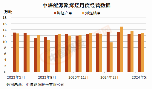 2024年5月份,中煤能源聚乙烯產(chǎn)量6.7萬噸,同比下降1.5%,環(huán)比增長4.7%;銷量6.8萬噸,同比持平,環(huán)比下降4.2%。聚丙烯產(chǎn)量5.8萬噸,同比下降7.9%,環(huán)比下降4.9%;銷量6.1萬噸,同比增加1.7%,環(huán)比下降7.6%。