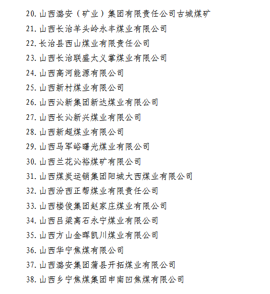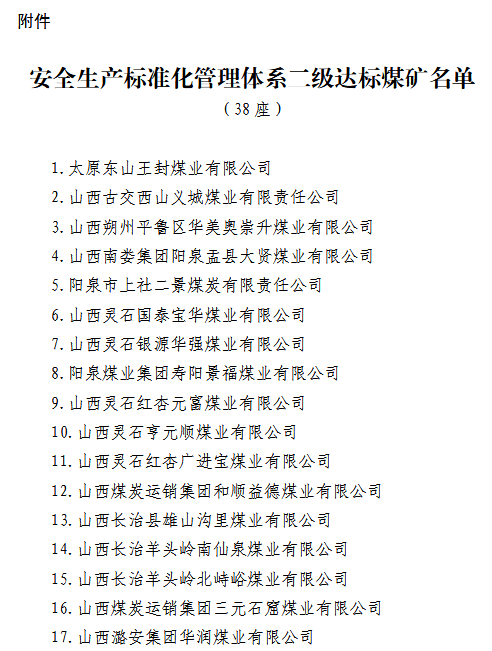 山西省應(yīng)急管理廳 山西省地方煤礦安全監(jiān)督管理局關(guān)于確認(rèn)太原東山王封煤業(yè)有限公司等38座煤礦為安全生產(chǎn)標(biāo)準(zhǔn)化管理體系二級達(dá)標(biāo)煤礦的通知
