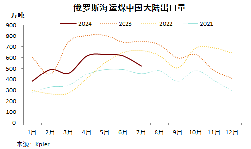 2024年1-7月份,俄羅斯海運煤出口量累計9320.57萬噸,同比降15.79%。今年以來,制裁、鐵路運力低以及物流成本高等因素制約著俄羅斯煤炭的出口。