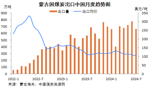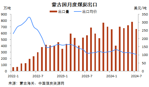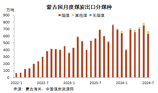 蒙古海關(guān)未給出單月數(shù)據(jù),根據(jù)歷史數(shù)據(jù)計(jì)算得出,2024年7月份,蒙古國煤炭出口量為664.46萬噸,同比增加99.05萬噸,增幅17.52%;環(huán)比減少114.13萬噸,降幅14.66%。