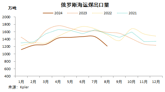 Kpler船舶追蹤數(shù)據(jù)顯示,2024年8月份,俄羅斯海運(yùn)煤出口量1214.92萬噸,環(huán)比降17.25%,環(huán)比連續(xù)第二月下降,同比降23.32%。