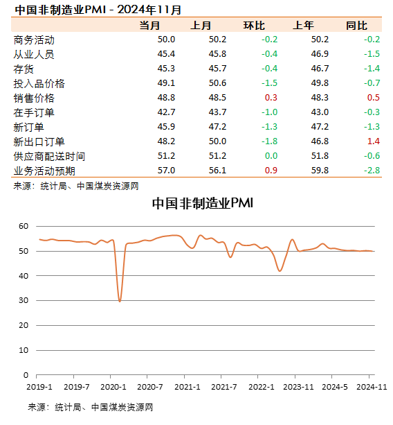 11月份,非制造業(yè)商務(wù)活動(dòng)指數(shù)為50.0%,比上月下降0.2個(gè)百分點(diǎn),位于臨界點(diǎn)。