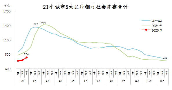 1月下旬,21個城市5大品種鋼材社會庫存734萬噸,環(huán)比增加60萬噸,上升8.9%,庫存升幅擴大;比年初增加75萬噸,上升11.4%;比上年同期減少132萬噸,下降15.2%。