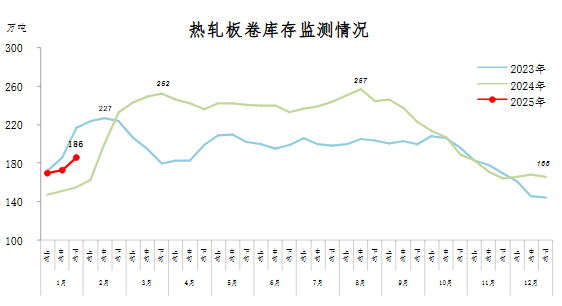 1月下旬,熱軋板卷庫存186萬噸,環(huán)比增加13萬噸,上升7.5%,庫存上升幅度擴大;比年初增加20萬噸,上升12.0%;比上年同期增加31萬噸,上升20.0%。