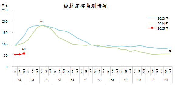 1月下旬,線材庫存58萬噸,環(huán)比增加4萬噸,上升7.4%,庫存升幅擴大;比年初增加2萬噸,上升3.6%;比上年同期減少47萬噸,下降44.8%。