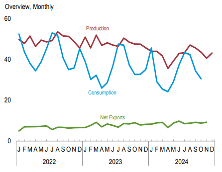 1月28日,美國能源信息署(EIA)發(fā)布最新《月度能源回顧》報告顯示,2024年12月份,美國煤炭產(chǎn)量為4318.3萬短噸(3917.5萬噸),較上年同期的4571.2萬短噸下降5.53%,較前一月的4077萬短噸增長5.92%。