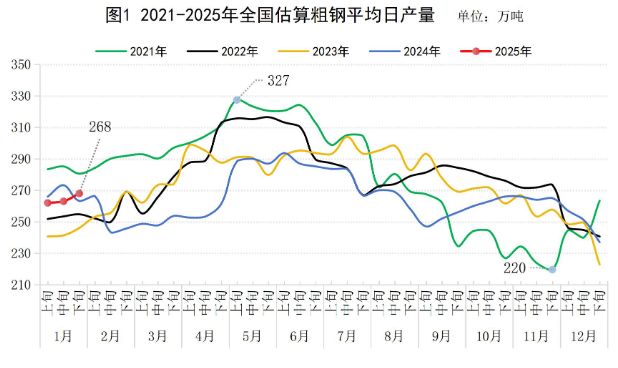 2025年1月下旬,重點(diǎn)統(tǒng)計(jì)鋼鐵企業(yè)共生產(chǎn)粗鋼2320萬(wàn)噸,平均日產(chǎn)210.9萬(wàn)噸,日產(chǎn)環(huán)比增長(zhǎng)1.8%;生鐵2089萬(wàn)噸,平均日產(chǎn)189.9萬(wàn)噸,日產(chǎn)環(huán)比增長(zhǎng)2.5%;鋼材2225萬(wàn)噸,平均日產(chǎn)202.3萬(wàn)噸,日產(chǎn)環(huán)比增長(zhǎng)2.6%(見(jiàn)表1)。