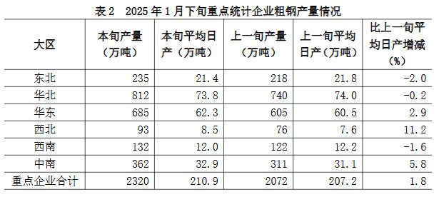 1月下旬六大地區(qū)中,除華東、西北、中南地區(qū)重點(diǎn)統(tǒng)計(jì)企業(yè)粗鋼日產(chǎn)量較上一旬有所增長(zhǎng)外,其它地區(qū)均有所下降(詳見(jiàn)表2),具體為:
