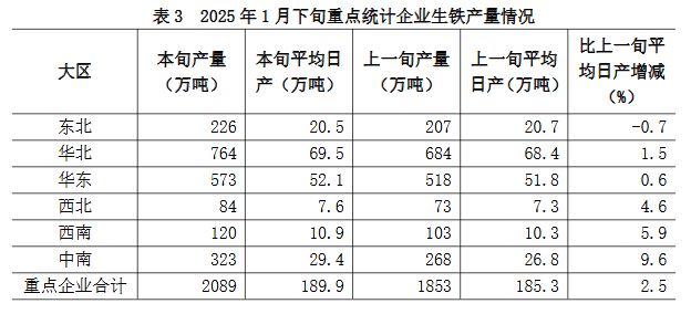 1月下旬六大地區(qū)中,除東北地區(qū)重點(diǎn)統(tǒng)計(jì)企業(yè)生鐵日產(chǎn)量較上一旬有所下降外,其它地區(qū)均有不同程度增長(zhǎng)(詳見(jiàn)表3),具體為: